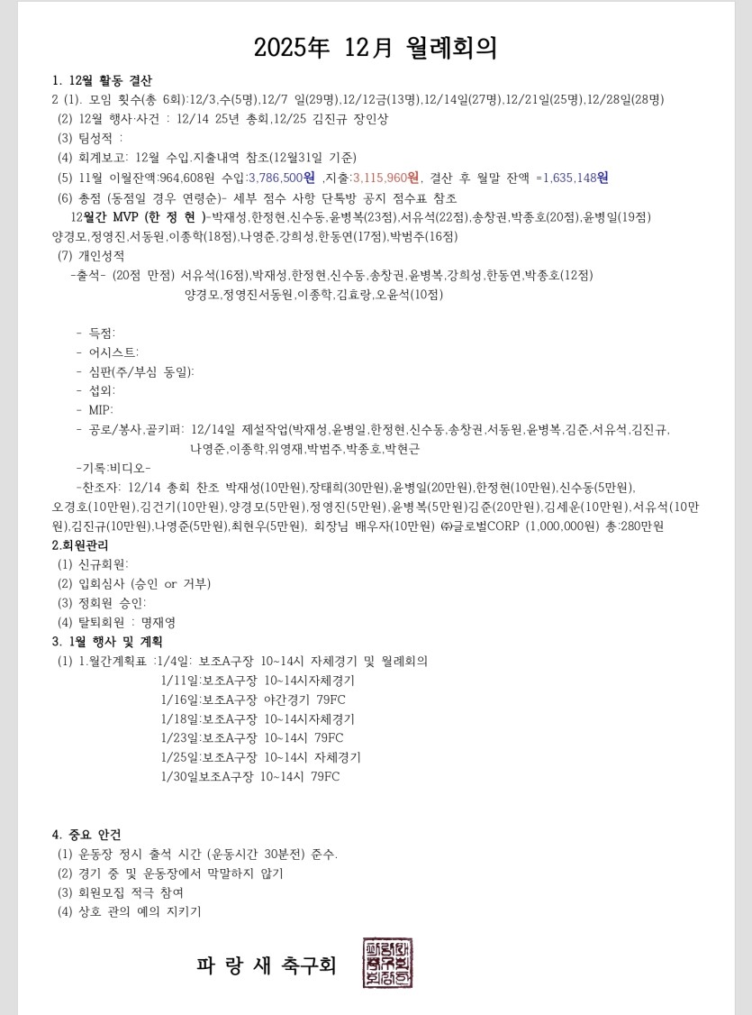 2026년 1월 월례회의 자료 작성자 정보 angleot0127 작성 작성일 2026.01.28 06:06 컨텐츠 정보 42 조회 목록 답글 쓰기 본문 1월 월례회이 관련자료 이전 2월 1일 운동공지 작성일 2026.01.31 15:04 다음 2025년 8월 결산 월레회의 내용 작성일 2025.09.24 13:58 댓글 0 등록된 댓글이 없습니다. Select File Upload File 목록 답글 쓰기